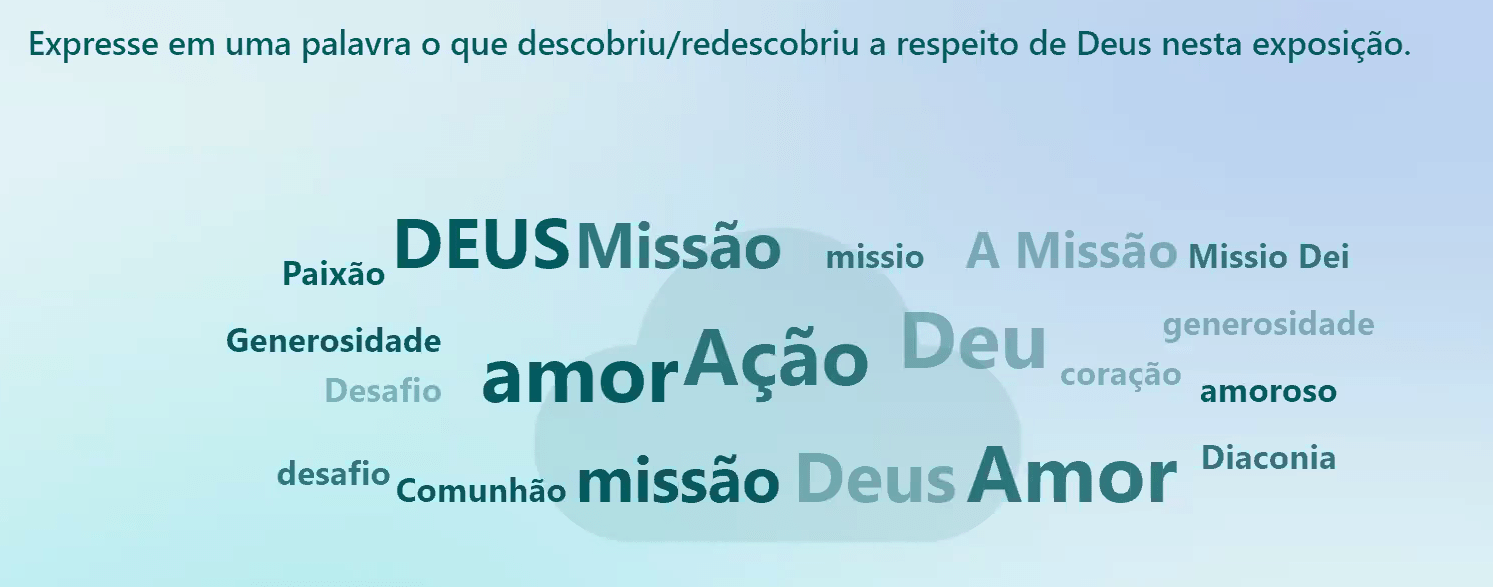 Após a palestra, houve um momento para atividade de reflexão individual e em pequenos grupos. Da reflexão individual surgiu uma nuvem de palavras destacando os sentimentos daquele momento. Em grupos, participantes dialogaram sobre como Deus atua através de nossas Comunidades.