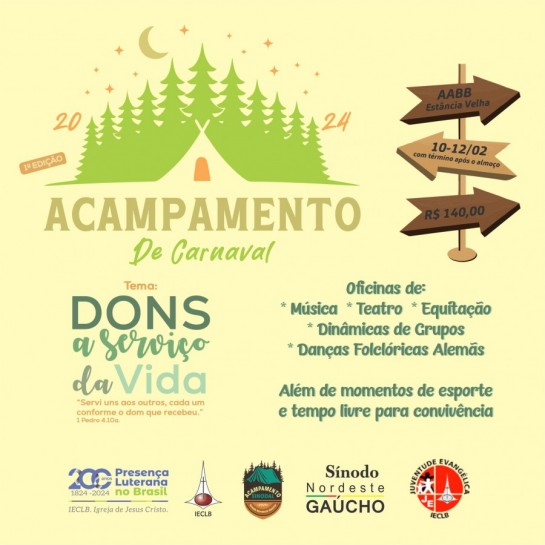 O feriadão de Carnaval está se aproximando! Já se inscreveu no acampamento sinodal? A Coordenação Sinodal da JE Sinodal está preparando, com muito carinho, o Primeiro Acampamento Sinodal de Carnaval,