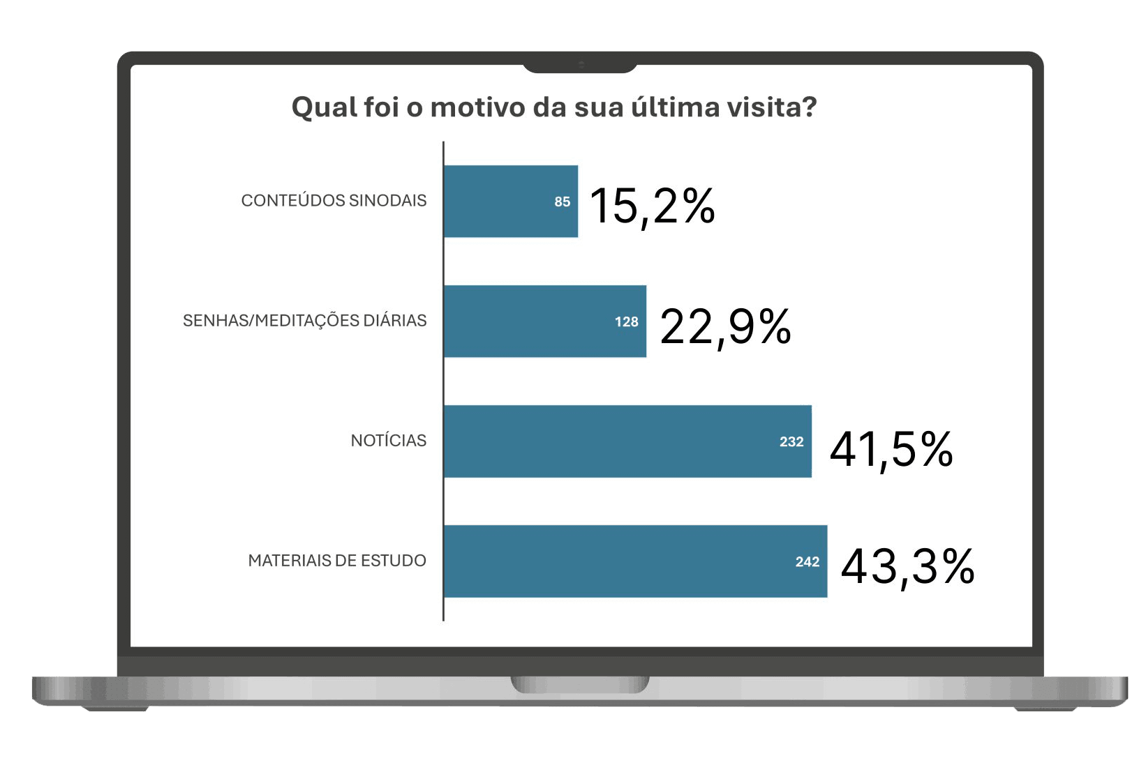 De forma resumida, as principais razões para acessar a plataforma são os materiais de estudo, representando 43,3%, seguido das notícias, com 41,5%. Devoções diárias aparecem como a terceira motivação, com 22,9%, e na sequência, temos os conteúdos sinodais, com 15,2 %.